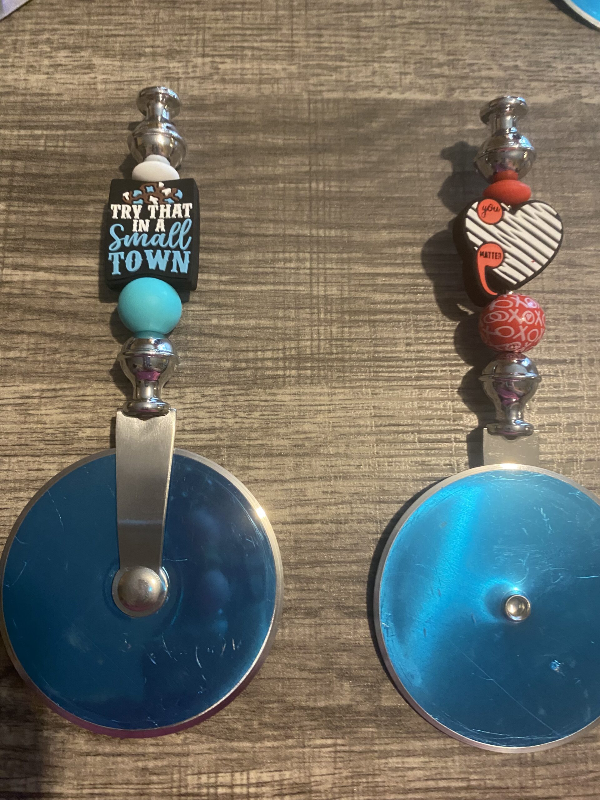 Pizza cutters made with silicone beads and fun focals. Fun way to serve